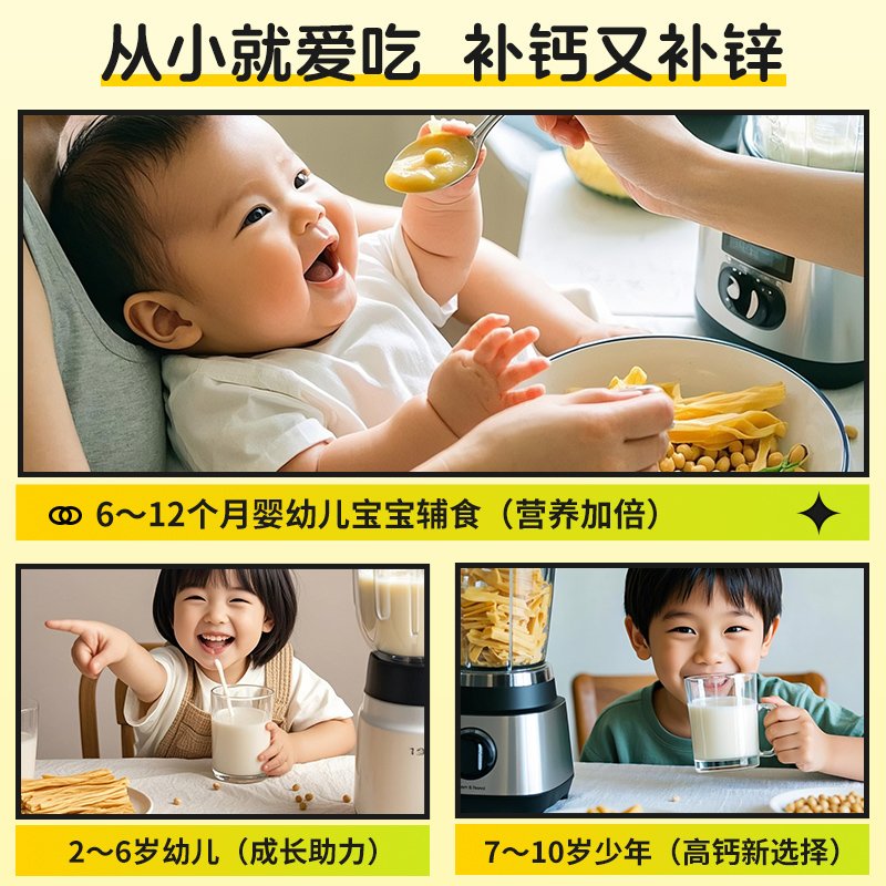 适用人群:6个月以上能吃辅食的宝宝,1-14岁补钙铁锌的儿童,非大豆过敏人群